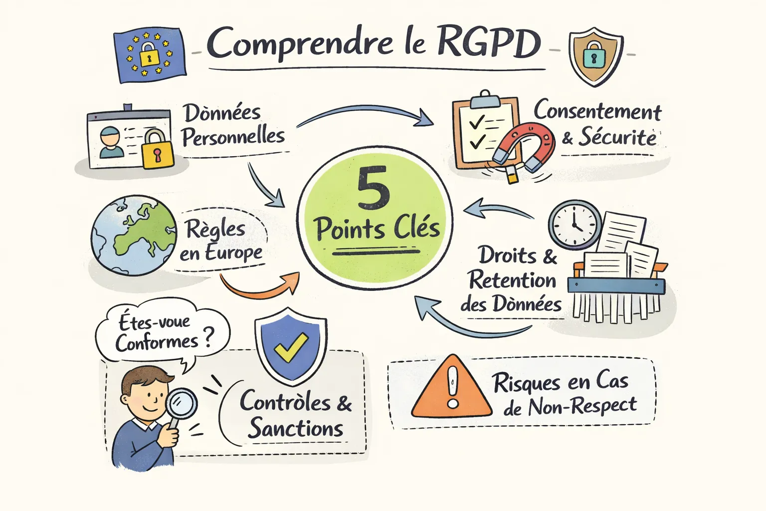 Pour comprendre le RGPD sur le terrain, retenez quelques principes contraignants : licéité, loyauté, transparence, proportionnalité et responsabilité. Les bases légales les plus courantes sont le consentement, l’exécution d’un contrat, l’obligation légale, l’intérêt légitime et l’exécution d’une mission d’intérêt public. Documentez la base choisie et conservez la justification dans vos registres pour pouvoir la démontrer lors d’un contrôle. Vous pouvez consulter les six grands principes du RGPD pour un rappel officiel et synthétique.